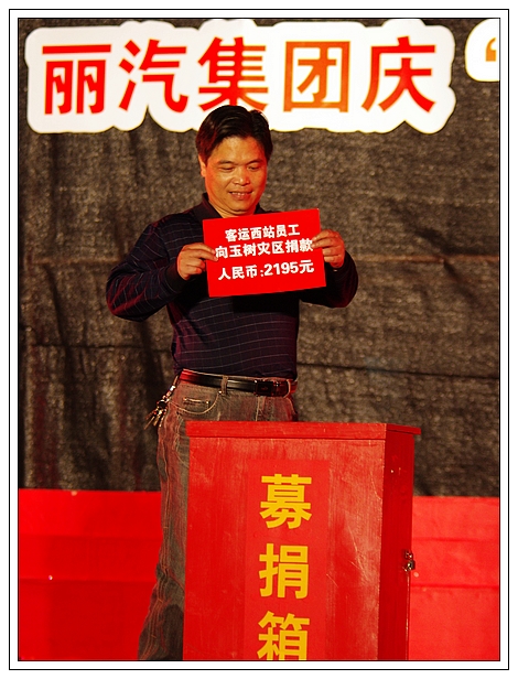 演唱會(huì)上,麗汽集團(tuán)員工為玉樹地震災(zāi)區(qū)進(jìn)行了捐款,所募集的21981元善款轉(zhuǎn)交市慈善總會(huì)。