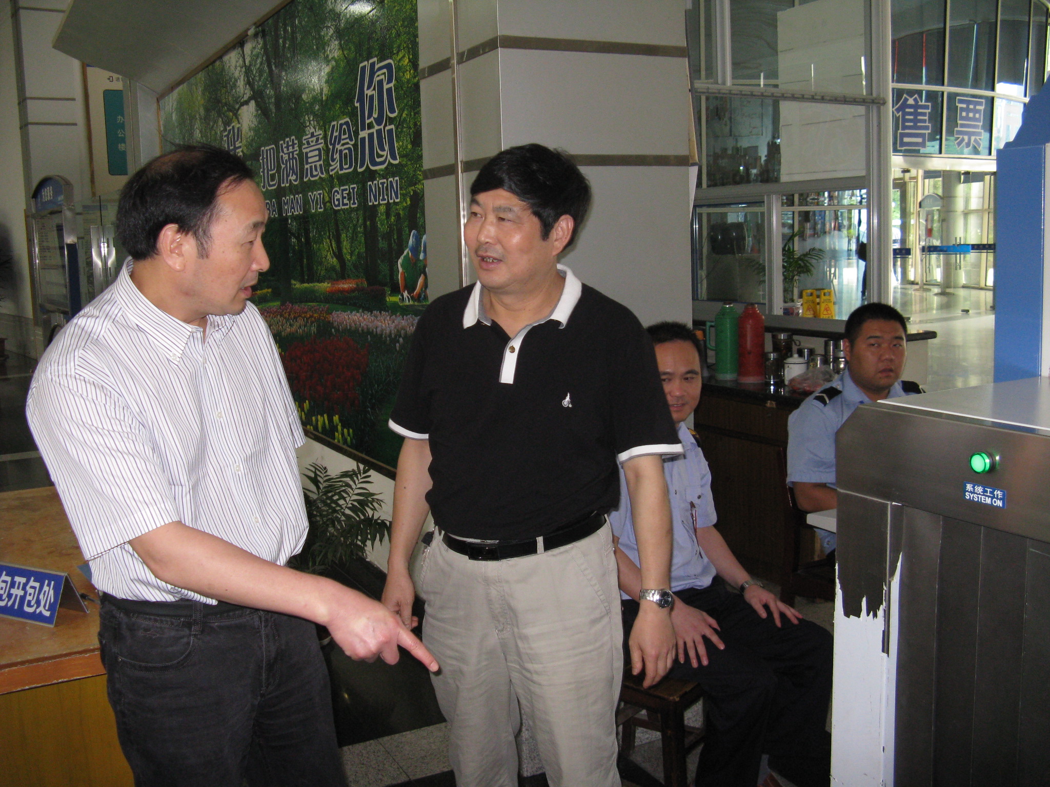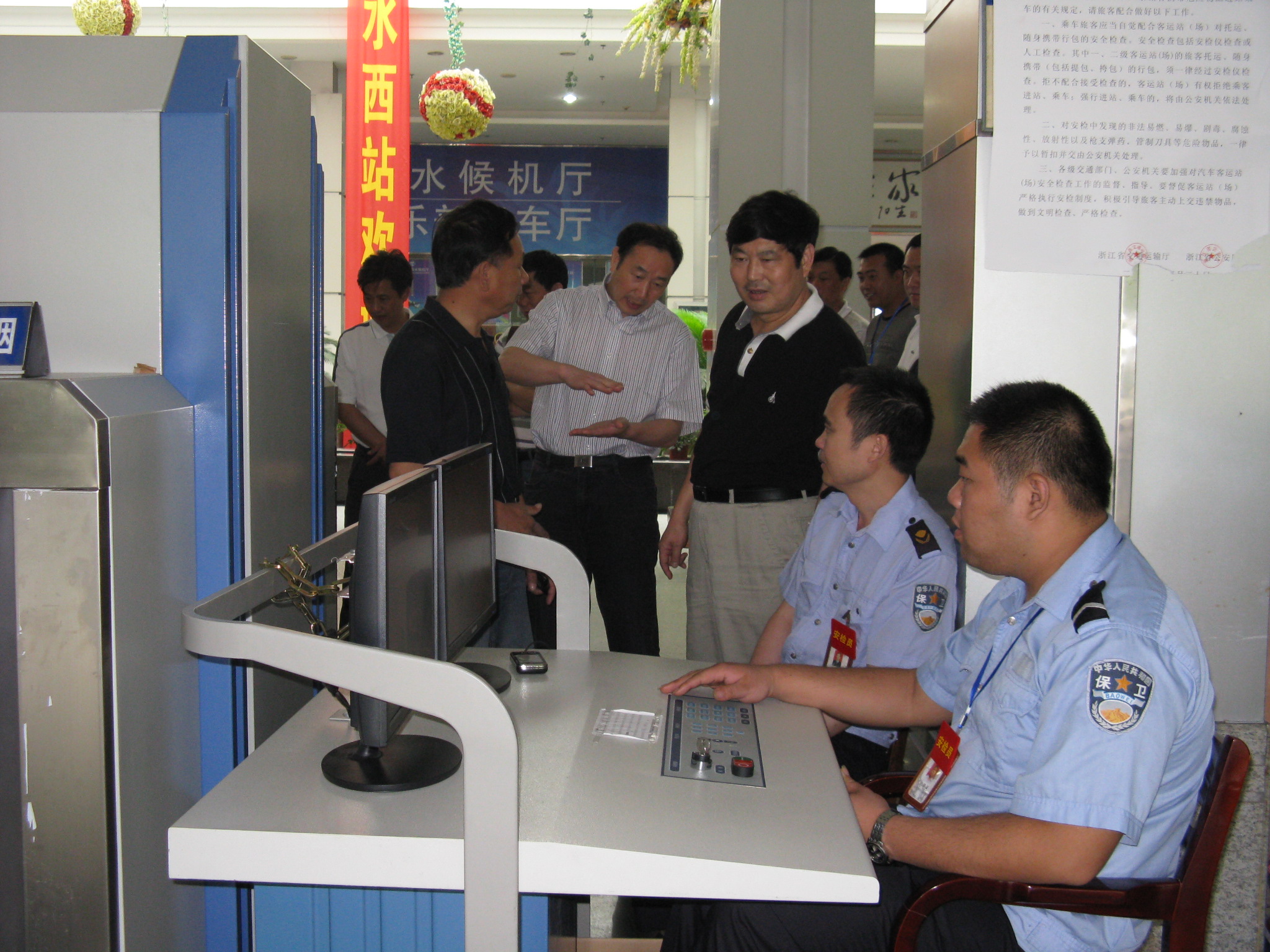 ,麗水市副市長葉朝丐、市交通局副局長吳和俊到客運西站檢查世博安保工作,葉朝丐詳細了解了客運西站新更換的危險品檢查儀的性能和使用情況,并聽取了相關(guān)人員的工作匯報。