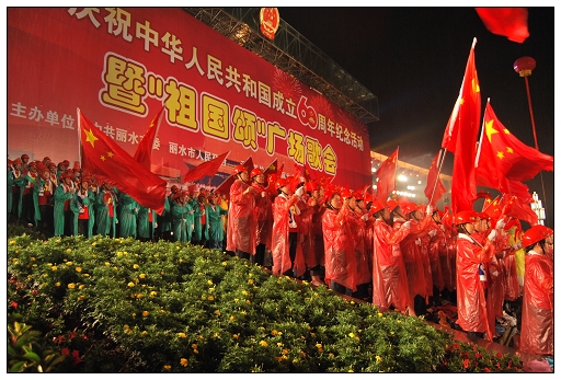 麗水市慶祝新中國成立60周年紀(jì)念活動(dòng)暨“祖國頌”廣場(chǎng)歌會(huì)隆重舉行。歌會(huì)分革命英雄贊、建設(shè)新中國、走進(jìn)新時(shí)代三個(gè)篇章進(jìn)行。15個(gè)方陣依次進(jìn)行大合唱,每個(gè)方陣各唱一首歌。