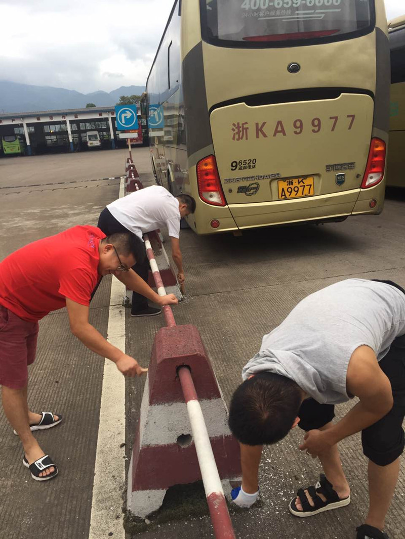 站場(chǎng)內(nèi)的隔離設(shè)施由于長(zhǎng)時(shí)間的日曬雨淋,出現(xiàn)了嚴(yán)重的油漆脫落現(xiàn)象。8月31日早上6點(diǎn),志愿者們又拿來(lái)鋼絲刷,先把隔離墩上還沒(méi)脫落完的油漆刷干凈,再用調(diào)好的油漆,重新粉刷隔離設(shè)施。