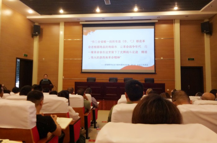 市委黨史研究室、市地方志辦公室主任雷華英從浙西南革命精神的歷史概況、內(nèi)涵和解讀、弘揚(yáng)踐行浙西南革命精神三個(gè)方面授課。在革命戰(zhàn)爭(zhēng)年代,老一輩革命家在麗水所有的縣市區(qū)都留下了光輝戰(zhàn)斗足跡,締造了偉大的“浙西南革命精神”。周恩來(lái)同志在麗水的抗戰(zhàn)史;粟裕、劉英同志帶領(lǐng)中國(guó)工農(nóng)紅軍挺進(jìn)師,與麗水人民一道浴血奮戰(zhàn),團(tuán)結(jié)一心干革命,播撒了開(kāi)啟光明的寶貴革命火種。直至如今,偉大精神已深深融入麗水大地,流淌在處州兒女的血脈中,成為激勵(lì)一代又一代麗水人堅(jiān)定理想信念、戰(zhàn)勝一切困難、奪取前進(jìn)道路上一個(gè)又一個(gè)勝利的力量源泉。