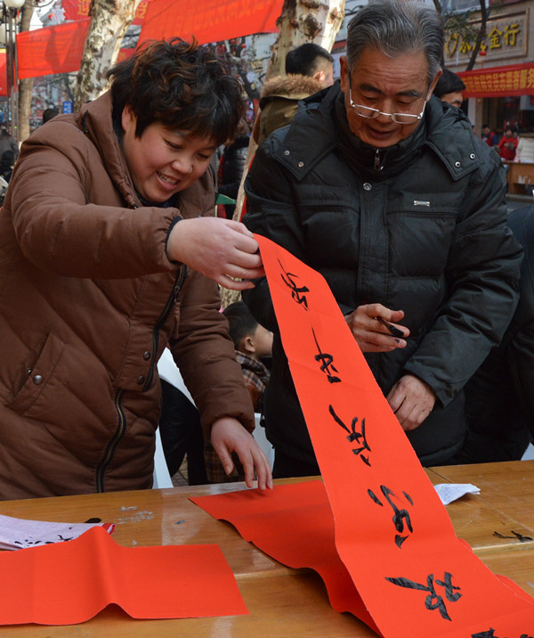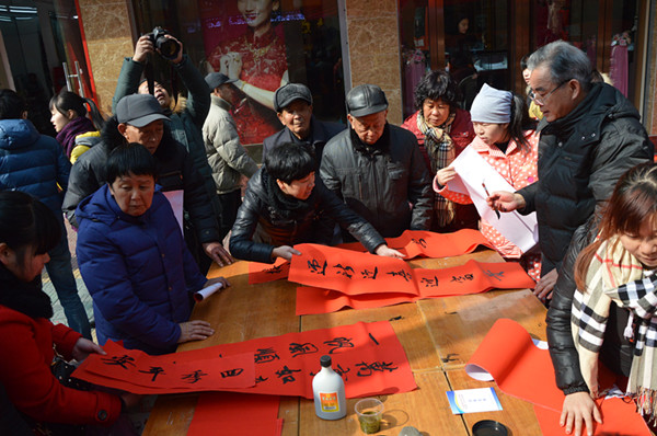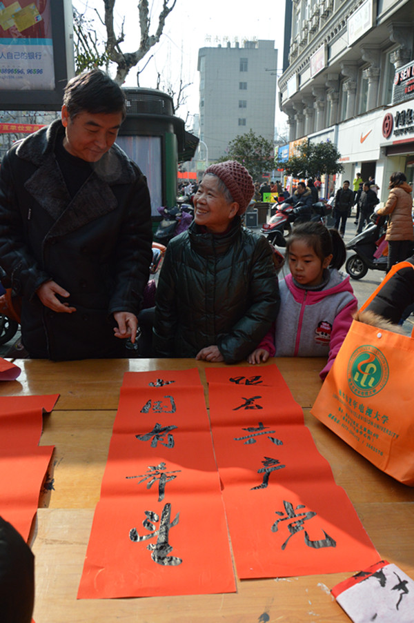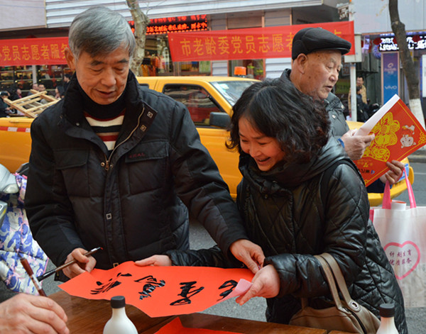 幾張小桌子拼成的簡易書案更是黨員一條街上靚麗的風景。三位老同志一落筆,書案旁邊一下子就圍滿了人,大家一邊排隊等候著“墨寶”,一邊點贊著三位老師的書法。葉女士高興地說:“手寫的春聯不僅更有年味,而且還是在弘揚中國的書法藝術。中國傳統(tǒng)的年俗文化,現在已經越來越難得了?!币粚﹄p胞胎寶寶的父母恰巧推著嬰兒車從服務點前經過,趕緊請老師寫下“開心寶貝”四個字,還說是給孩子倆最珍貴的新年禮物。