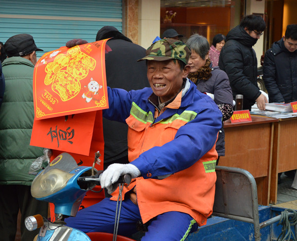 環(huán)衛(wèi)工人接過麗汽集團黨員送上的福字和春聯臉上樂開了花