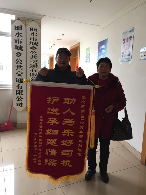 2月23日,麗水市城鄉(xiāng)公交公司的辦公室來了一對樸實的夫婦,他們拿著一面印有“護送孕婦恩情深,助人為樂好司機”字樣的錦旗,指明要送給501路公交車司機劉海偉:“多虧了劉師傅幫忙,我兒媳婦才平安生下了大胖小子!”