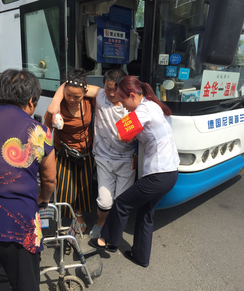 9:35金華到麗水的班車緩緩地駛進(jìn)了高鐵配載點(diǎn)。車一停穩(wěn),旅客們便陸陸續(xù)續(xù)的下車前往下一個(gè)目的地。眼尖的江旭紅看見(jiàn)一位中年婦女在車門處很吃力的拉著什么,江旭紅心想,車上可能有行動(dòng)不便的旅客需要下車。江旭紅全然不顧烈日的暴曬,毫不猶豫的迎上前去。果不其然,車門處的阿姨和車上的另一個(gè)阿姨正連拉帶抱的幫一位行動(dòng)不便的大叔下車。大叔看上去50多歲的樣子,因?yàn)榈昧四撤N疾病一點(diǎn)都不會(huì)做自主的動(dòng)作,全憑兩位阿姨慢慢地挪動(dòng),160多斤的體重給兩位阿姨扶他下車增加了不少的難度。才移下一個(gè)臺(tái)階,汗珠已經(jīng)順著兩位阿姨的臉頰往下淌。江旭紅立即從行李倉(cāng)拿出他們隨車攜帶的輪椅撐開(kāi),放在車門旁。由于車子臺(tái)階處較窄,站不下其他的人,江旭紅就在車下位置幫著把大叔的腳抬起來(lái),待大叔被移到最后一級(jí)臺(tái)階時(shí),江旭紅順勢(shì)托起大叔的一只手,和車上那位阿姨一起,使盡渾身力氣一步一步慢慢地把大叔架到了輪椅上。接著江旭紅又把大叔送到陰涼處,等待家人來(lái)接。這時(shí)的江旭紅已是滿頭大汗,背上的衣服都濕透了。