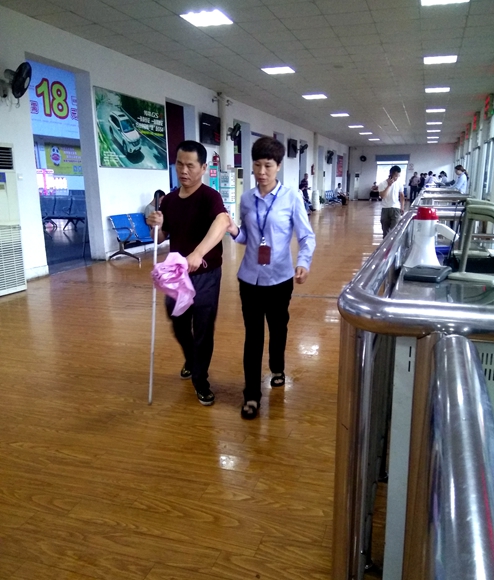 9:35到青田的車即將開始檢票,章莉走到盲人旅客跟前,準備扶他提前檢票上車,這時盲人旅客不好意思的說:“我想去下廁所?!闭吕蛘f:“好的,我扶你去?!闭吕蛞恢狈鲋と寺每偷侥袔T口,因不方便進到男廁里面,章莉就叫住了一位男旅客,叫他幫忙把盲人旅客扶進去上廁所,自己則在男廁門口等待。好心的男旅客很爽快地答應了,嘴里還一直夸章莉的服務好、東站的服務好。