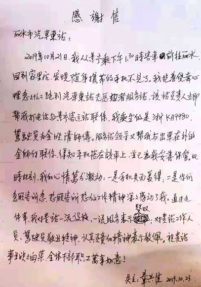 11月18日,東站服務(wù)臺收到了乘客章興佳親手送來的一封感謝信,這是一封寫給東站業(yè)務(wù)站站長鄭宣偉的感謝信,信中寫到失主章興佳于10月21日從景寧乘車到麗水,不慎將手機(jī)遺落在車上,在他發(fā)現(xiàn)手機(jī)不見后,抱著僥幸的心里來到服務(wù)臺尋求幫助時,業(yè)務(wù)站站長鄭宣偉第一時間幫他聯(lián)系駕駛員尋找手機(jī)的事情。