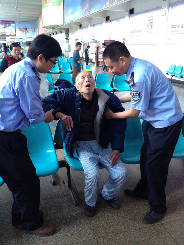 5月8日下午16:00左右,東站保潔員吳麗君在打掃候車室的男廁所衛(wèi)生時(shí),發(fā)現(xiàn)一位80多歲、老人身著病號(hào)褲的老人家呼吸困難、面色暗黃地倒在廁所內(nèi)。吳麗君急忙上前詢問,老人目光無神,神志不清,已經(jīng)說不出話了。