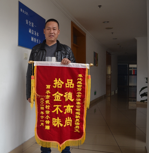 “拾金不昧,本不是新聞了,但輪到自己親身體驗(yàn)這種社會(huì)正能量的日益增長(zhǎng),還是讓我倍感欣喜?!?0月16日傍晚,在江蘇開(kāi)超市的徐先生手拿錦旗,來(lái)到快客分公司車(chē)隊(duì),對(duì)駕駛員湯勇文拾金不昧的精神予以表?yè)P(yáng)。他說(shuō),11月14日他乘坐18:45從杭州回麗水的班車(chē),一時(shí)大意把隨身的錢(qián)包遺失了,里面有五千多元的現(xiàn)金和若干張銀行卡。次日,當(dāng)他焦急萬(wàn)分來(lái)到快客車(chē)隊(duì)時(shí),卻發(fā)現(xiàn)駕駛員湯勇文正拿著妥善保管的皮夾等著他?!?br/> 據(jù)了解,當(dāng)天晚上11時(shí)左右,駕駛員湯勇文在做下客后的檢查時(shí),發(fā)現(xiàn)一只皮夾被旅客遺落在車(chē)廂通道上,他打開(kāi)皮夾一看,足有好幾千元的現(xiàn)金和各類(lèi)卡,他心想,這么重要的東西旅客一定會(huì)再回來(lái)找的,他把情況向值班隊(duì)長(zhǎng)報(bào)告后,又在下客區(qū)足足等了十余分鐘,也不見(jiàn)旅客回來(lái)找。于是,他將皮夾保管完好等著歸還旅客,也就有了開(kāi)頭一幕。